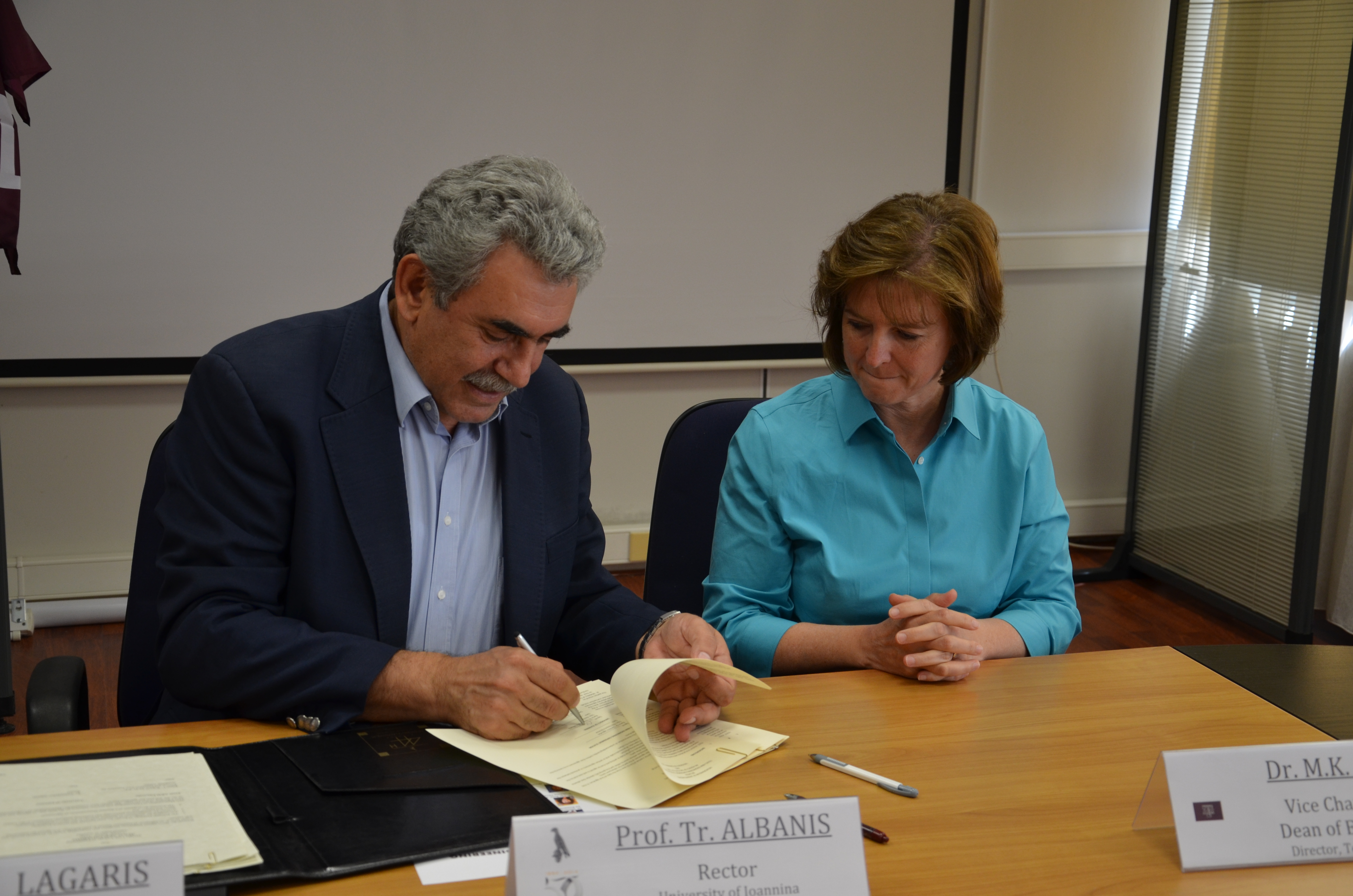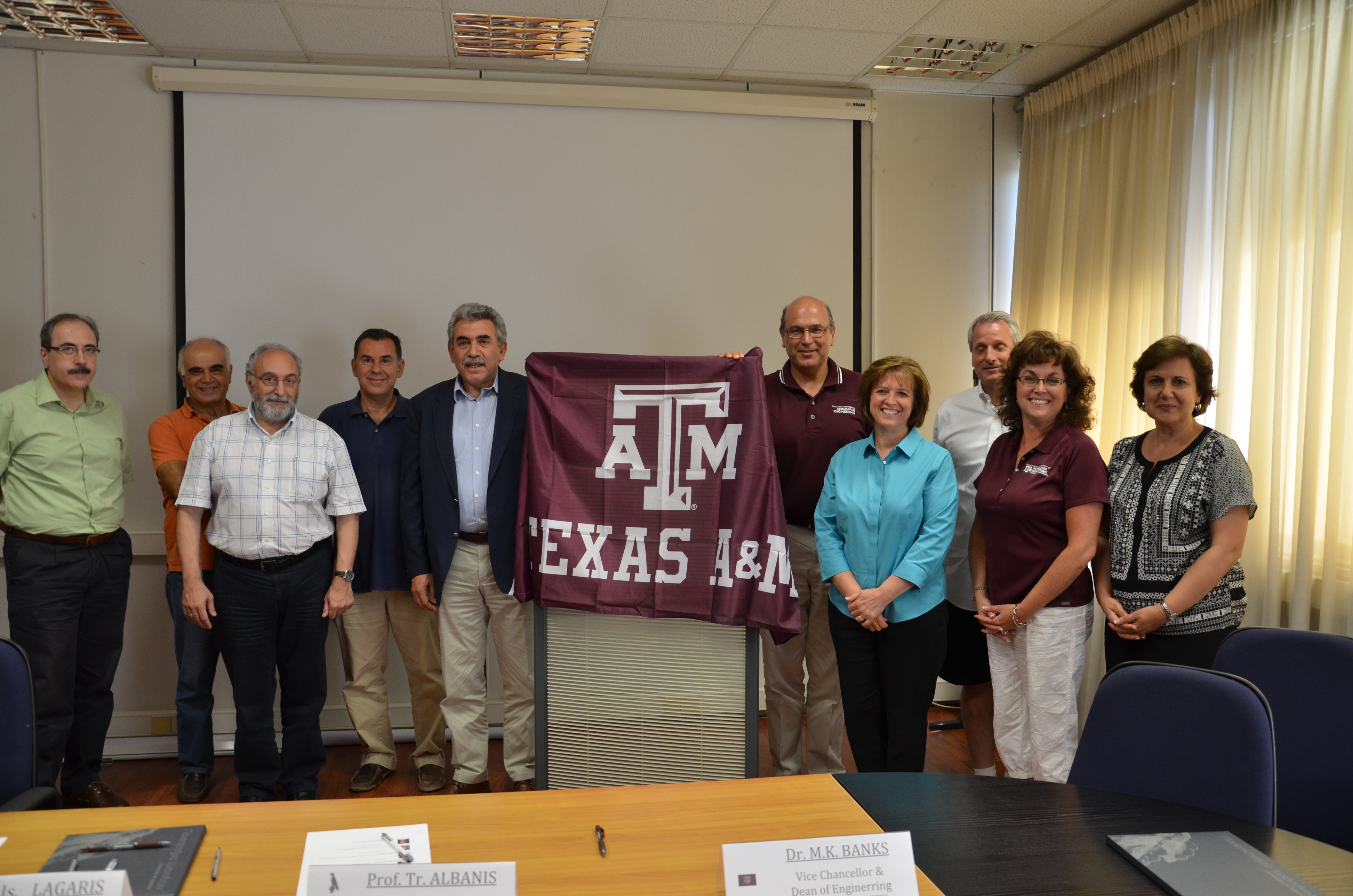 In July 2014, a Memorandum of Understanding (MOU) was signed between Texas A&M University, USA and the University of Ioannina (UOI), Greece. This MOU aims in fostering cooperation between the Texas A&M Engineering Experiment Station (TEES) and the Mechanics, Smart Sensors and NDE (MSS-NDE) Laboratory, Materials Science & Engineering Dept., UOI, in the areas of: (a) Mobility of faculty members and researchers; (b) Mobility for studies and research; (c) Submission of joint research proposals. The MOU was signed by Professor Katherine Banks (Vice Chancellor and Dean of Engineering, Texas A&M), Professor Triantafyllos Albanis (Rector, UOI), Professor Dimitris Lagoudas (Senior Associate Dean for Research, College of Engineering; Deputy Director, TEES; Assoc. Vice Chancellor for Engineering Research Aerospace Engineering, Texas A&M), and Professor Theodore Matikas (Director, MSS-NDE Laboratory, UOI).